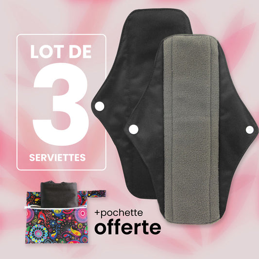 Lot de Serviettes Hygiéniques noires Lavables et Réutilisables en fibre de Bambou Naturel